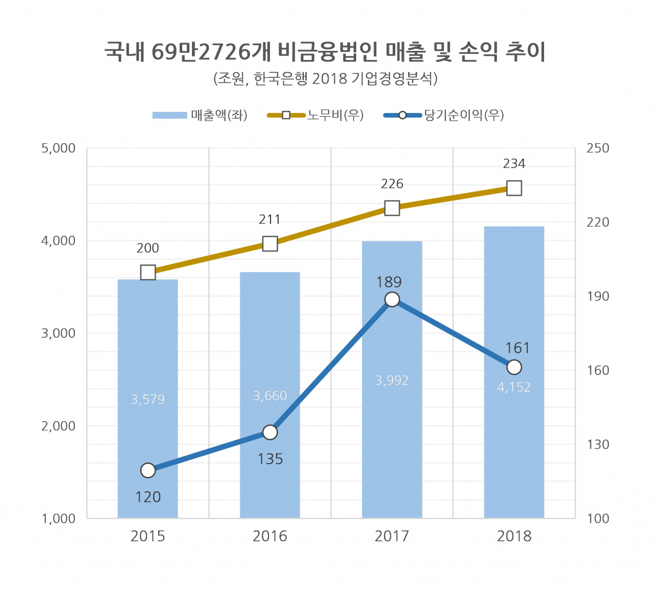 11일 한국은행의 ‘2018년 기업경영분석’에 따르면 지난해 국내 비금융 영리법인기업(상장사·외부감사대상기업·비외부감사대상 기업 등 69만2726곳)의 매출액은 총 4151조6000억원으로 집계됐다. 전년보다 4.0%(160조1000억원) 증가했지만 영업이익은 3.9%(9조5000억원) 감소했고, 순이익은 14.5%(27조4000억원)나 빠졌다. 어닝쇼크 수준이다.