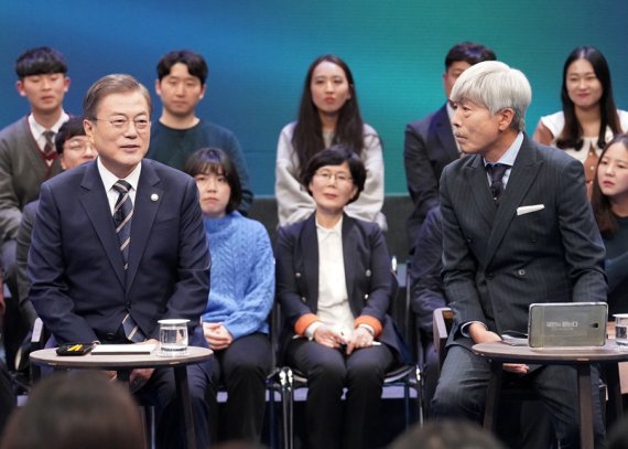 文 "허심탄회하게 말하고 듣겠습니다"/문재인 대통령이 국민들과의 직접소통에 나섰다. 문 대통령은 19일 오후 서울 MBC 미디어센터에서 열린 '국민이 묻는다, 2019 국민과의 대화'에 참석해 국민들과 허심탄회하게 사회 전반의 문제에 대해 이야기를 나눴다. 문 대통령이 사회자 배철수와 대화하고 있다. 뉴시스 |