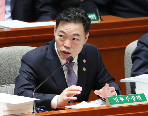 김오수 법무부 차관(장관 직무대행)이 지난 8일 국회 예산결산특별위원회 전체회의에서 의원 질의에 답변하고 있다. /연합뉴스 |