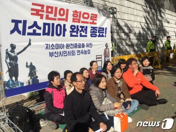 21일 부산지역 시민단체가 부산 동구 초량동 일본총영사관 앞에서 지소미아 폐지를 촉구하는 농성을 펼치고 있다.(아베규탄 부산시민행동 제공)© 뉴스1 |