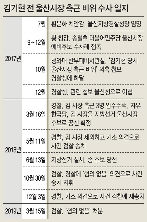 울산지검 공안부는 지난해 지방선거 직전 경찰이 수사한 김 전 시장의 비서실장 등 측근 3명에 대한 뇌물수수 의혹 첩보가 대통령민정수석비서관 산하 반부패비서관실→경찰청→울산경찰청 순으로 이첩된 사실을 확인했다. 당시 민정수석은 조국 전 법무부 장관이었다. 특히 검찰은 울산경찰청이 수사 착수 당시 첩보가 청와대에서 내려온 사실을 인지했던 정황과 진술까지 확보하고 수사 중인 것으로 확인됐다.