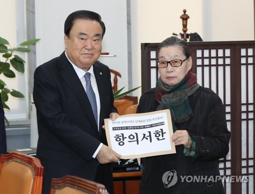 이 자리에서 피해자 측은 "반인권·반역사적인 피해자 배상 관련 입법 추진을 그만두라"며 반대 뜻을 전하고 문 의장이 제시한 강제동원 피해자 배상 해법에 대한 항의서한을 전달했다.