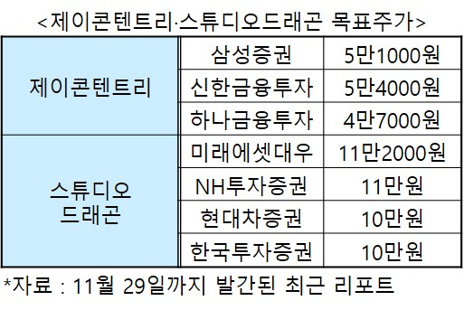 29일 금융투자업계에 따르면 신한금융투자는 제이콘텐트리 목표주가를 기존보다 10% 높은 5만4000원으로 변경했다. 삼성증권(5만1000원)과 하나금융투자(4만7000원) 역시 최근 목표주가를 높였다.