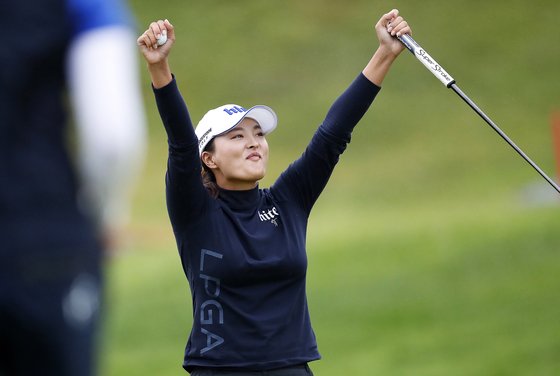 지난 7월 29일 열린 LPGA 투어 에비앙 챔피언십 최종 라운드 18번 홀에서 우승을 확정한 뒤 기뻐하는 고진영. [EPA=연합뉴스] |