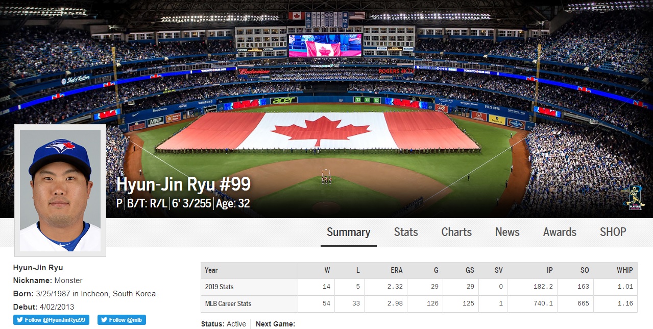 류현진 소개란은 토론토 모자를 쓴 프로필 사진으로 변경됐고, 기존 별명란은 다저스 시절과 마찬가지로 KBO 리그에서 얻은 '괴물'을 영어로 쓴 'Monster'로 유지됐다. 선수 사진 위로 토론토 홈구장 로저스센터 그라운드 내 캐나다 국기가 펼쳐진 사진이 게재됐다.