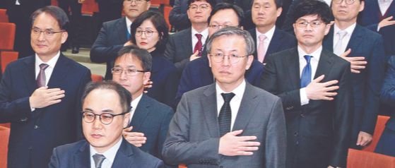 대검찰청 박찬호 공공수사부장(왼쪽), 한동훈 반부패·강력부장(오른쪽 둘째) 등이 2일 서울 대검찰청에서 열린 신년회에서 국민의례를 하고 있다. 이날 윤석열 검찰총장은 ’올해도 검찰 안팎의 여건은 결코 쉽지 않을 것“이라면서도 ’정당한 소신을 끝까지 지켜드리겠다“고 밝혔다. [뉴스1] |