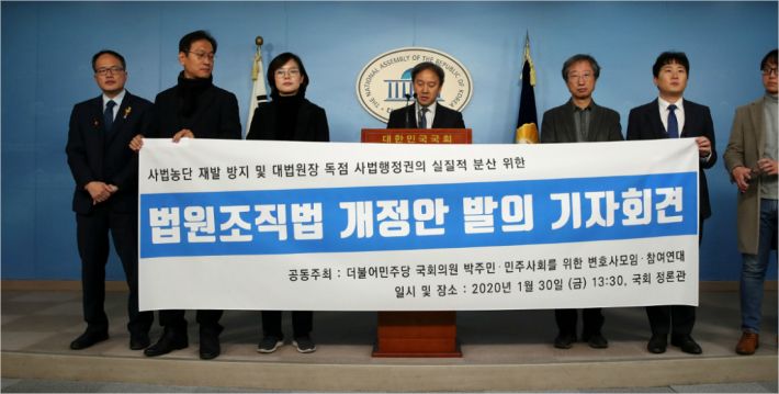3일 박주민 더불어민주당 의원과 민주사회를위한변호사모임(민변) 참여연대는 국회 정론관에서 이러한 내용의 법원조직법 개정안을 발표했다. 대법원장 1인이 모든 법관의 인사권을 포함해 법원행정처라는 조직에 대한 권한을 독점하고 있는 현재 구조를 깨는 데 방점을 찍은 내용이다.