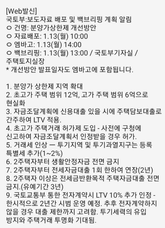 그런데 강 수석이 언급한 내용은 지난 10일 SNS를 통해 돌았던 정부의 부동산 대책 관련 지라시에 등장하는 9개 방안 중 일부와 유사하다. 이 지라시는 국토부가 13일 정부세종청사에서 분양가상한제 개선방안 관련 백브리핑을 한다는 알림 형식 메시지였다. 국토교통부의 실제 보도계획 형식과도 유사해 온라인상에서 "정부가 진짜 이런 대책을 검토하는 것이냐"며 혼선이 일었다.