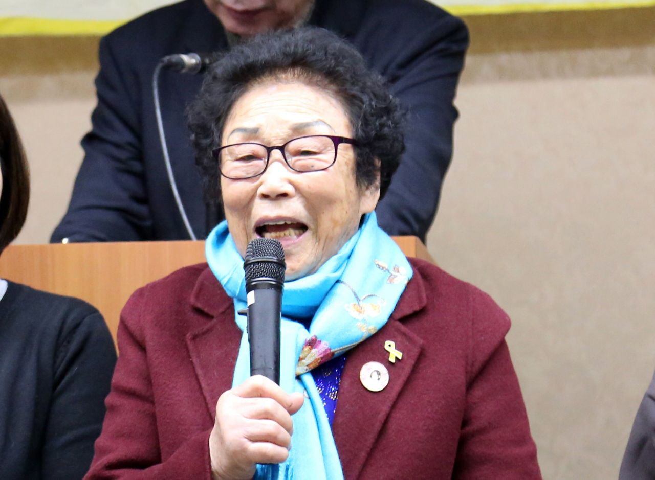 일제 강점기 징용 피해자인 양금덕(91) 씨가 17일 오후 일본 도쿄에서 열린 '금요행동' 500회 기념 특별 집회에서 인사말을 하고 있다. [연합뉴스] |