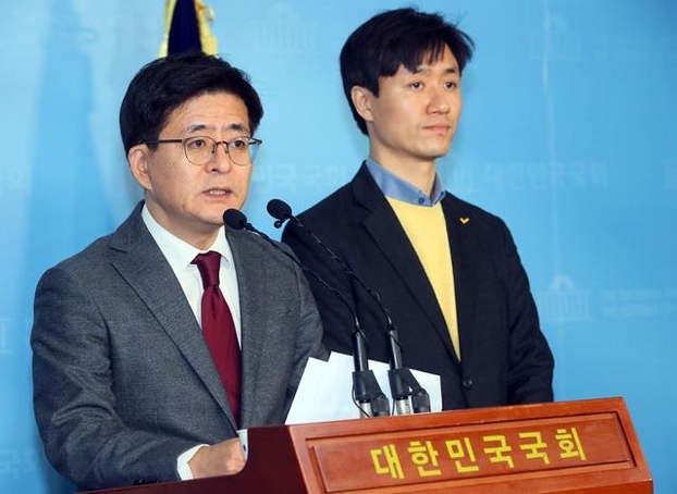 박원석(왼쪽) 정의당 정책위의장이 29일 국회 정론관에서 '최고임금제' 총선 공약을 발표하고 있다. /연합뉴스 |