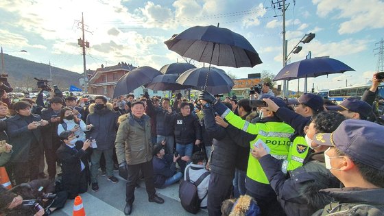 30일 오후 중국 우산 교민을 격리 수용할 시설인 충남 아산시 경찰인재개발원을 찾은 진영 행정안전부 장관과 양승조 충남도지사 등이 주민들이 던진 계란과 과자봉지를 피하고 있다. 신진호 기자 |