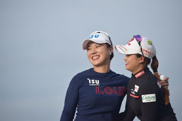 박희영(왼쪽)이 9일 호주 빅토리아주 서틴스 비치 골프 링크스의 비치 코스에서 열린 LPGA투어 ISPS 한다 빅 오픈 연장 4차전 끝에 우승하며, 준우승을 차지한 최혜진(오른쪽)과 포옹하고 있다. 골프 오스트레일리아 제공 |