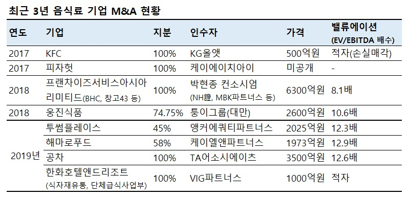 2017~2018년에는 식음료 기업에 대한 투자자들의 인식이 이보다 훨씬 부정적이었다. PEF CVC캐피탈은 지난 2017년 KFC를 운영하던 SRS코리아 지분 100%를 약 500억원에 매각했다. 2014년 1000억원을 투입해 인수했으나, 되팔 때는 절반 가치밖에 인정받지 못해 원금까지 날렸다. 2018년에는 치킨 프랜차이즈 bhc, 소고기 전문점 창고43 등 5개 브랜드를 운영하던 프랜차이즈서비스아시아리미티드(FSA)가 경영자인 박현종 회장에게 인수됐다. 국내 최대 경영자 인수(MBO) 거래로서 이목을 끌었지만, 기업가치는 EBITDA 배수는 8.1배 수준으로 비교적 낮게 평가됐다.