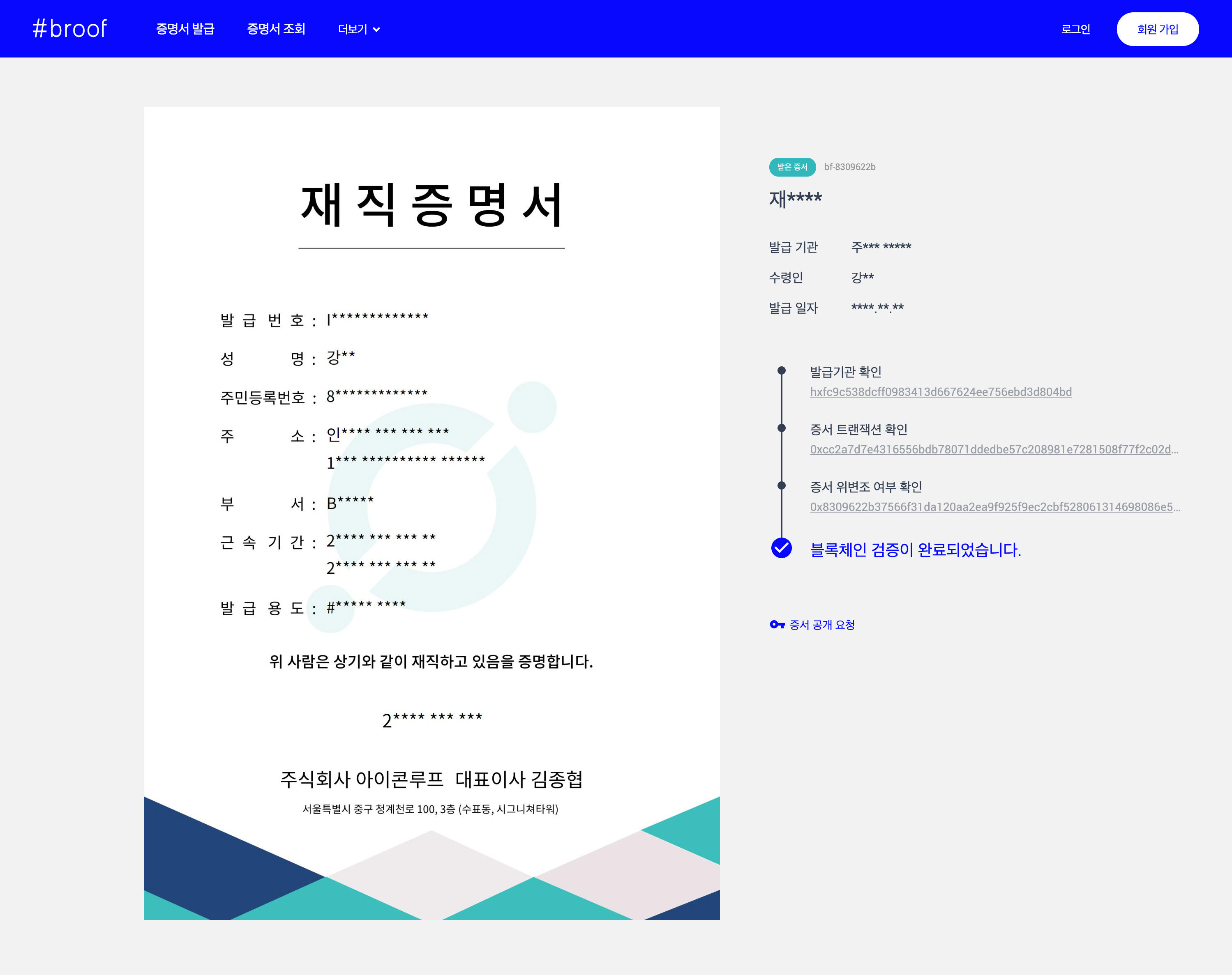 브루프는 기관이 데이터시스템을 별도로 구축하지 않고도 증서를 발급할 수 있어 기존의 종이문서 발급 및 보관 비용을 절감할 수 있다. 수령자는 원하는 시간과 장소에서 블록체인 증명서를 조회할 수 있으며 증서 정보 공개 여부 또한 직접 선택해 활용할 수 있다. 이를 통해 개인정보 보호까지 가능하다는 설명이다.