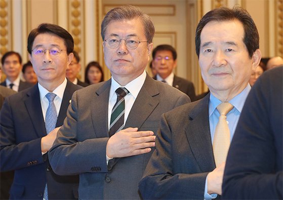 문재인 대통령이 11일 청와대에서 고용노동·환경·농림축산식품부의 업무보고를 받기 전 국민의례를 하고 있다. 왼쪽부터 조정식 더불어민주당 정책위의장, 문 대통령, 정세균 국무총리. [청와대사진기자단] |