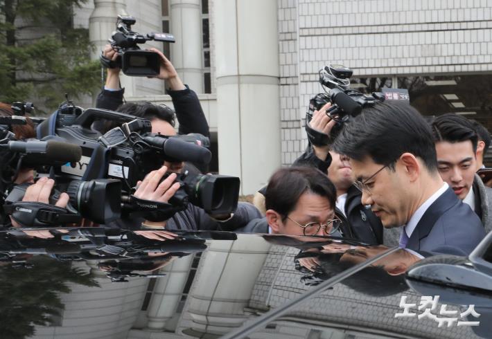 성창호 영장전담 부장판사가 13일 오전 서울 서초구 서울중앙지방법원에서 1심 선고를 마치고 차량에 탑승하고 있다. 이날 법원은 공무상 비밀누설 혐의로 기소된 신광렬·조의연·성창호 부장판사에게 1심에서 무죄를 선고했다.