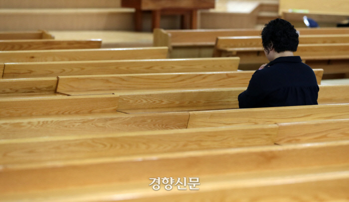교회에 출석 중인 개신교인의 71%가 코로나19 확산으로 ‘주일예배 중단’에 찬성한다는 설문조사 결과가 27일 발표됐다. 사진은 한 신자가 교회에서 기도를 드리는 모습. 경향신문 자료사진. |