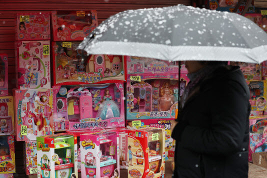 16일 오후 서울 종로구 창신동 문구완구거리에서 우산을 쓴 시민이 제품을 둘러보고 있다.(사진=연합뉴스) |