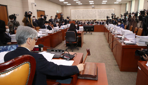 4일 오전 국회 법제사법위원회 전체회의에서 여상규 위원장이 의사봉을 두드리고 있다. 연합뉴스 |
