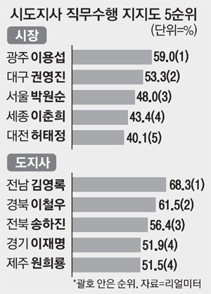 반면 양승조 충남도지사는 1.4%포인트 내린 45.7%, 이시종 충북도지사는 1.6%포인트 내린 47.3%, 송철호 울산시장은 1.6%포인트 내린 26.3%로 각각 집계됐다. 지지도 순위로 보면 김영록 지사가 10개월 연속 1위를 기록했고, 이철우 지사, 이용섭 시장, 송하진 지사가 지난달과 마찬가지로 각각 2위, 3위, 4위를 기록했다. 권영진 시장은 지난달 8위에서 5위로 순위가 뛰었고, 이재명 지사가 6위였다. 이어 원희룡 지사, 최문순 강원도지사, 박원순 시장, 이시종 지사, 양승조 지사, 이춘희 시장이 7~12위에 각각 이름을 올렸다. '꼴찌'인 17위는 송철호 시장이 차지했다. 자세한 내용은 리얼미터 홈페이지나 중앙선거여론조사심의위원회 홈페이지를 참고하면 된다.
