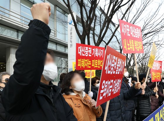 라임펀드 투자자들이 지난 2월 14일 오후 서울 여의도 금융감독원 앞에서 대신증권라임펀드 환매 보상 촉구 집회를 열고 구호를 외치고 있다. 뉴스1 |