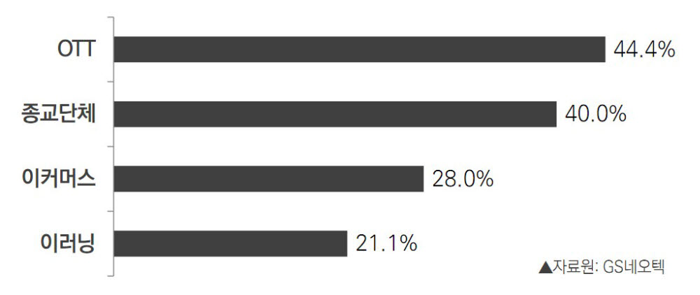 업종별로는 OTT가 44.4%로 가장 높고, 교회 등 종교단체 40.0%, 온라인 쇼핑몰 등 이커머스 28.0%, 이러닝 21.1% 순으로 나타났다.