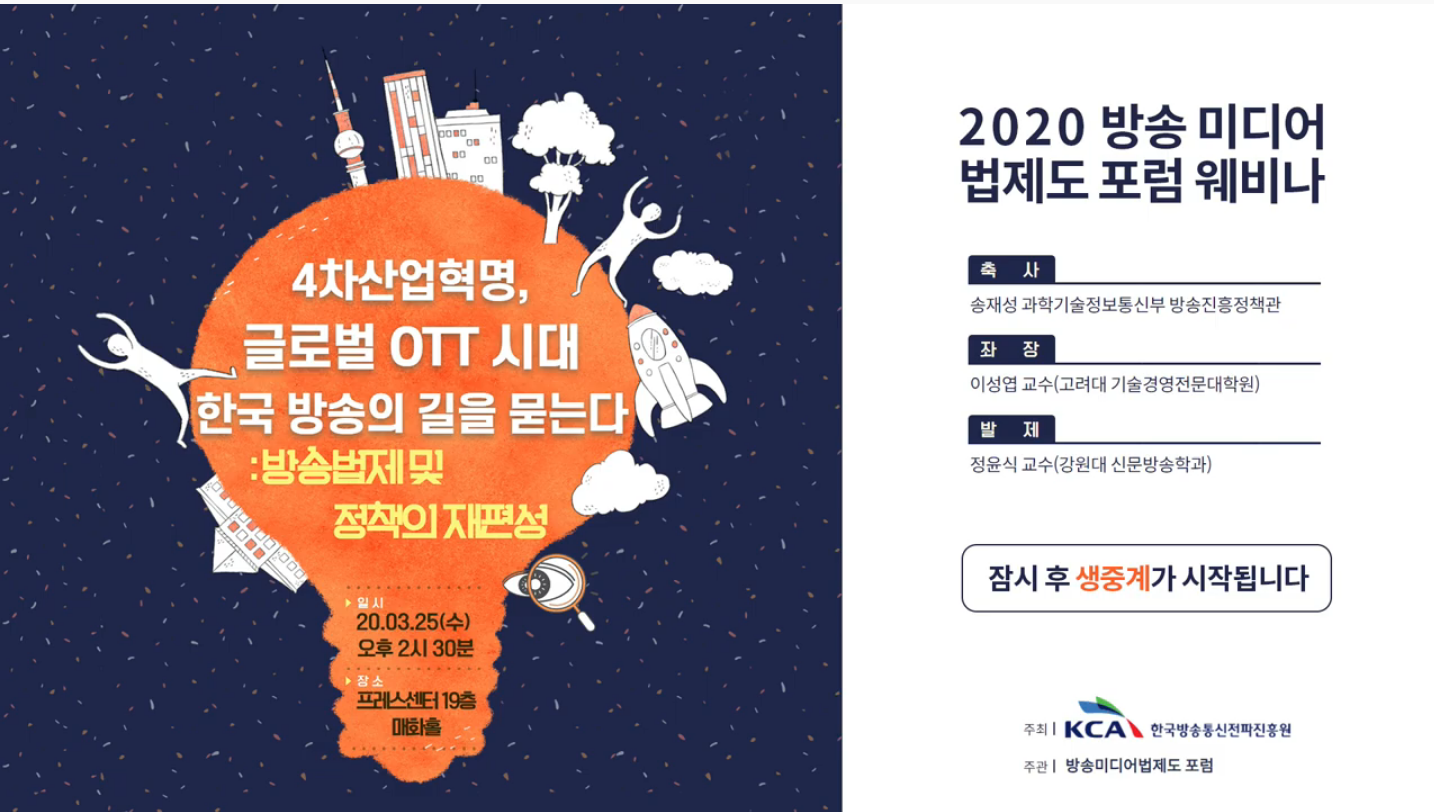 한국방송통신전파진흥원(KCA)이 주최하고 방송미디어법제도 포럼이 주관한 '2020방송 미디어법제도 포럼 웨비나'에서 정윤식 강원대 교수는 '4차 산업혁명, 글로벌 OTT시대 한국방송의 길을 묻는다' 주제로 발표했다. 정 교수는 구글, 애플, 아마존 같은 글로벌 기업에 대한 규제를 하지 않는다면 전반적인 위기를 자초할수 있다는 주장이다.