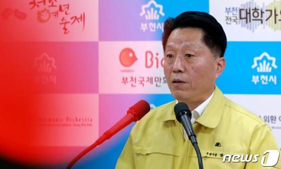 장덕천 부천시장이 지난 13일 오전 부천시청 브리핑룸에서 긴급기자회견을 하고 있다. /뉴스1 |