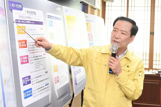 구인모 거창군수가 30일 군청 상황실에서 코로나19 대응 지역경제살리기 종합대책을 발표하고 있다. 거창군 제공 |