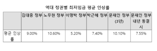 역대 정부의 최저임금 평균 인상률의 경우 김대중 정부 9.0%, 노무현 정부 10.6%, 이명박 정부 5.2%, 박근혜 정부 7.4%였다. 앞선 3년간 문재인 정부의 최저임금 평균 인상률은 10.1%로 노무현 정부와 비슷하다. 올해 최저임금이 동결될 경우 평균 인상률은 7.55%로 박근혜 정부 수준으로 낮아지게 된다.