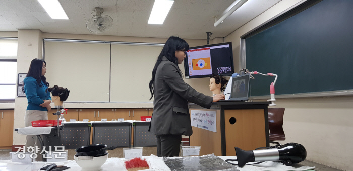 16일 오전 대전 대덕구 오정동 대전생활과학고 헤어실습실. 교탁 앞에 홀로 선 백인영 교사가 실습실 한쪽에 있는 모니터를 보며 학생들의 주의를 다잡았다. 실습실에서는 2학년 토털뷰티과 학생들의 헤어미용 실습 수업이 온라인 쌍방향 수업으로 진행되고 있었다. 백 교사는 교탁 위에 놓인 노트북으로 동영상을 재생하며 학생들에게 파마 시술 방법을 강의했다. 이날 수업에는 백 교사와 함께 또 다른 전공 교사 한 명이 2인1조로 참여했다. 류지연 교사는 백 교사와 함께 수업을 하며 학생들에게 헤어 염색 방법을 가르쳤다. 미용 실습용 마네킹과 각종 미용 도구들이 놓여 있는 것이 여느 고등학교 교실 풍경과는 다른 모습이었다.