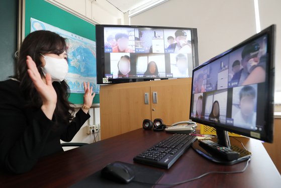 전국 초등학교 4~6학년 및 중·고등학생 1~2학년이 온라인 개학을 맞은 16일 오전 경기도 성남시 당촌초등학교에서 교사가 쌍방향 온라인 수업을 시연하고 있다. [뉴스1] |