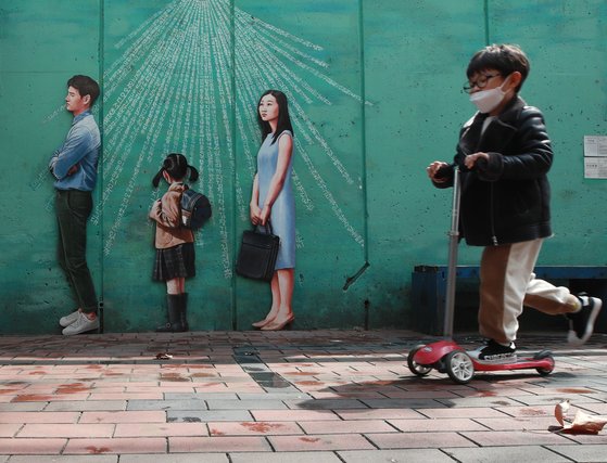 지난달 19일 오후 대구시 중구 대봉동 김광석길에서 마스크를 쓴 아이가 킥보드를 타고 있다. 연합뉴스 |