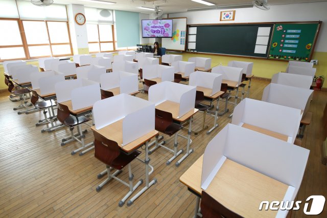 등교개학에 대비해 책상 간격을 띄우고 책상마다 가림막을 설치한 초등학교 교실./뉴스1 © News1 |