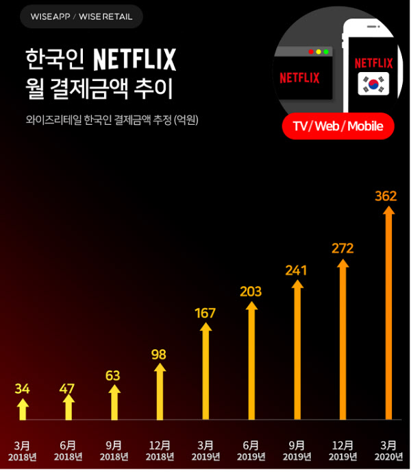 28일 앱 분석업체 와이즈앱/와이즈리테일은 국내 넷플릭스 결제금액 추정치(3월 기준)를 발표했다. 국내에서 지난 3월에 신용카드, 체크카드로 넷플릭스에 결제한 금액을 표본 조사하는 방식이다.