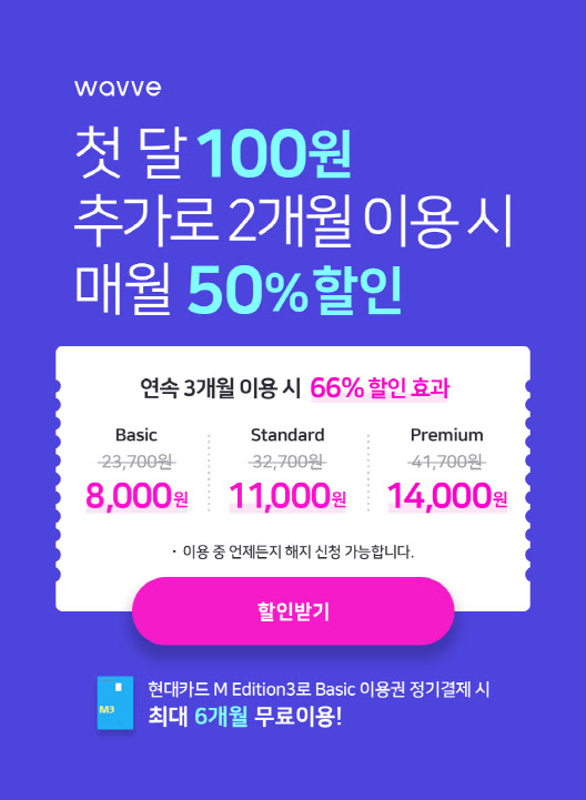 웨이브의 가장 저렴한 상품 베이직(HD화질)의 경우 월 7900원이지만, 이번 프로모션을 통해 첫 달 100원, 2번째 달 3950원, 세번째 달 3950원에 이용할 수 있다. 웨이브 스탠다드(풀HD화질, 동시이용 2명)는 3개월 11000원, 프리미엄상품(최상위화질, 동시이용 4명)은 3개월 14000원이 적용된다.