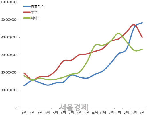 올 1~4월 신종 코로나바이러스 감염증(코로나19) 사태 기간 동안 국내 넷플릭스 이용 시간이 전년 동기 대비 1억 시간 늘어난 것으로 조사됐다. 쿠팡, 웨이브, 마켓컬리 등 국내 언택트(비대면) 서비스들도 같은 기간 100% 이상 이용 시간이 크게 증가했다.