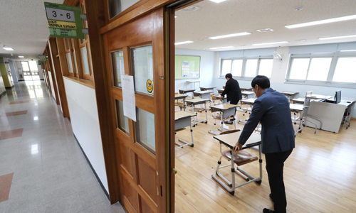 지난 1일 세종시의 한 고등학교에서 등교 개학을 대비해 코로나19 확산 방지 책걸상 배치 등을 점검하고 있다. 연합뉴스 |