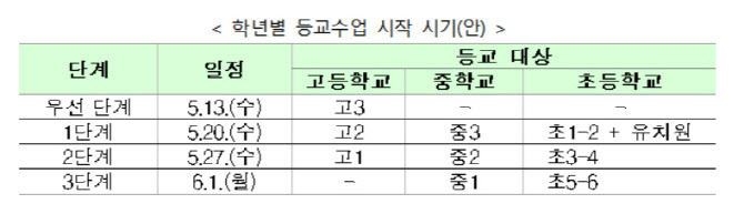 이날 교육부는 5월13일 고등학교 3학년 학생들을 우선 등교수업을 실시하고, 20일부터 순차적 등교를 실시한다고 밝혔다.◇`대입 준비` 고3 우선 등교…`돌봄 부담` 초1~2·유치원도 이른 등교