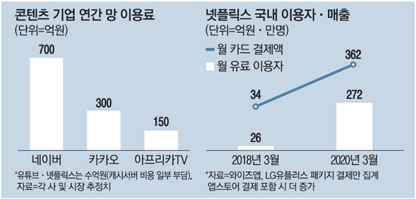 KT와 SK브로드밴드, LG유플러스 등 인터넷서비스제공업체(ISP·망 사업자)와 CP는 지난 몇 년간 망 이용료를 놓고 갈등을 빚었다. 작년 한 해 통신 3사는 5G(5세대) 네트워크 확장에 8조원을 쏟아부었지만, 국내 동영상 시장의 60~70%를 점유한 해외 CP들로부터 망 이용료를 전혀 받지 못했다. 국내 사업자들이 얼마의 이용료를 내는지는 정확히 알려지지 않았지만, 2017년 자료에 따르면 네이버가 매년 700억원 이상, 카카오가 약 300억원, 아프리카TV(150억원)와 대형 게임사들이 100억원을 내고 있는 것으로 추정된다.