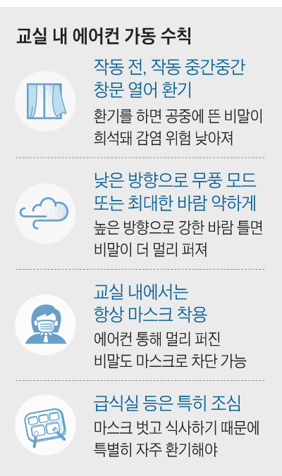 교실에서 에어컨 켜려면 창문 3분의 1 이상 열고 침방울 안날리게 무풍 모드