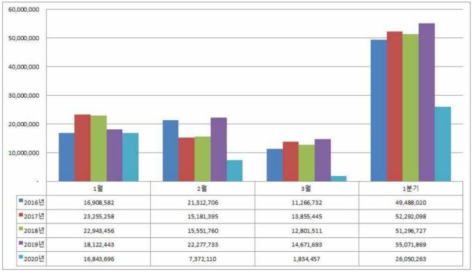 이와 달리 극장은 초토화됐다. 영화진흥위원회에 따르면 올해 1분기 극장 관객 수는 2605만명으로 지난해 같은 기간(5507만명)보다 53%가량 줄었다. 매출액 역시 2211억원으로 전년 동기(4677억원) 대비 약 53% 감소했다. 지난달 7일 기준 관객 1만5429명은 2004년 이후 최저치였다. 4월 둘째 주말 전체 관객 수는 9만8705명으로 역시 2004년 이래 최저 수준이었다.