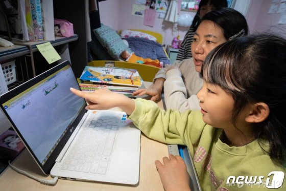신종 코로나바이러스 감염증(코로나19) 확산으로 '온라인 개학' 중인 지난달 20일 서울시내 한 가정에서 초등학교 3학년 학생이 엄마와 함께 e학습터 접속을 기다리고 있다. /사진=뉴스1 |