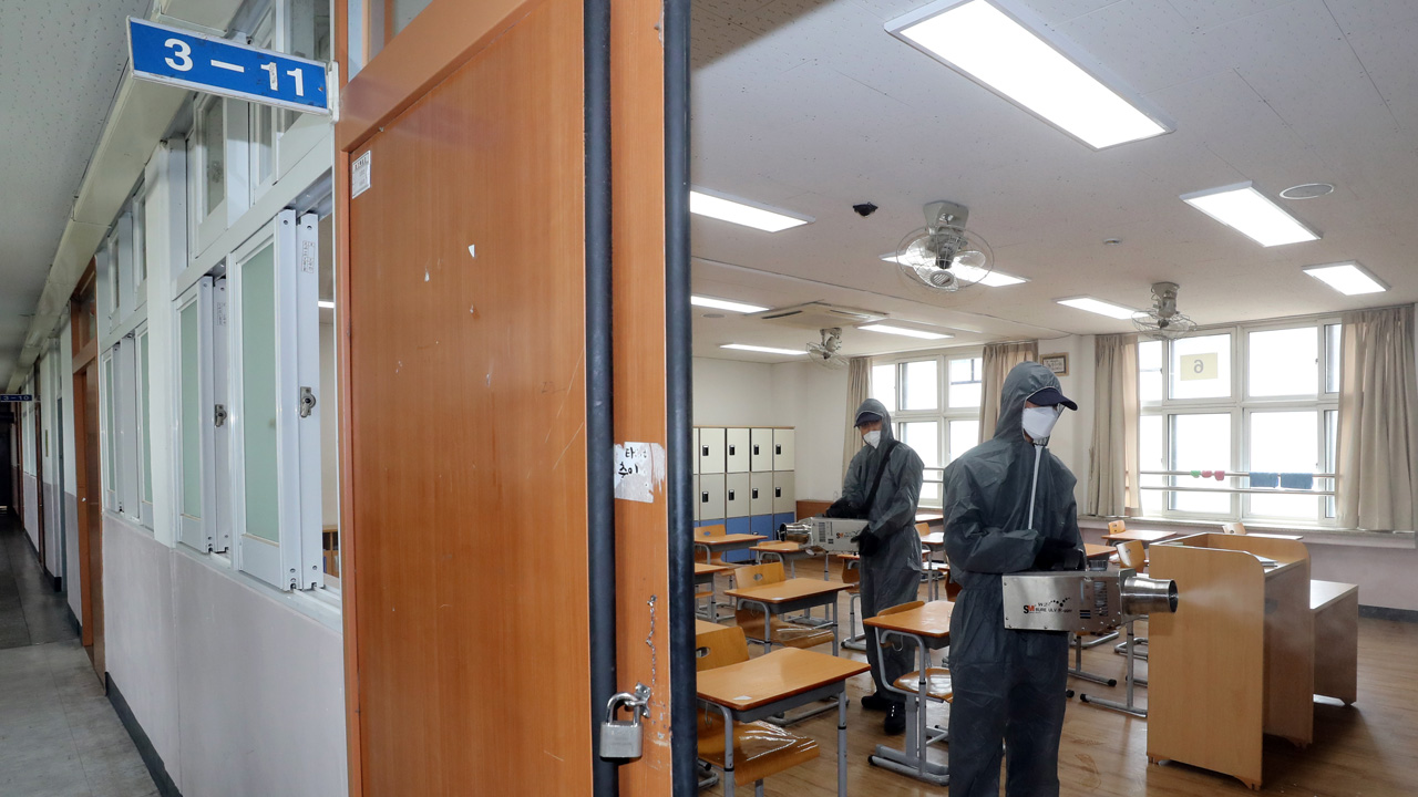 11일 오전 서울 송파구 영동일고등학교에서 송파구청 직원들이 개학을 앞둔 고3 교실 방역 소독을 하고 있다.