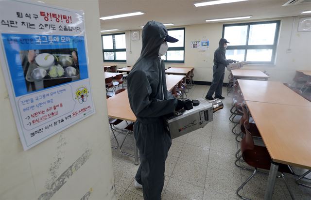 이태원 클럽 집단감염 여파로 교육부가 등교 일정을 일주일씩 순연한 11일, 서울 성동구 덕수고에서 방역 관계자들이 급식실을 소독하고 있다. 연합뉴스 |