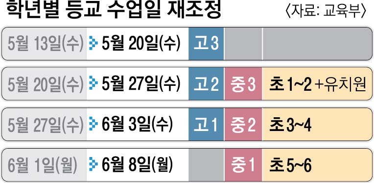 교육부에 따르면 13일로 예정됐던 고3의 등교 수업이 20일로 연기된 데 이어 고2·중3·초1~2·유치원생 등교는 27일, 고1·중2·초3~4학년 등교는 6월 3일, 중1과 초5~6학년 등교는 6월 8일로 각각 1주일씩 순연됐다. 코로나19 확산 때문에 각급 학교의 개학이 연기된 것은 다섯 번째다. 박 차관은 “2차 감염이 발생한 데다 해당 클럽 방문자 가운데 역학조사는 44%만 진행돼 감염병 통제 가능성에 대한 우려가 큰 상황”이라며 “지역감염 확산 우려를 고려하면 5월 연휴 이후 최소 2주가 필요해 이같이 판단했다”고 밝혔다.