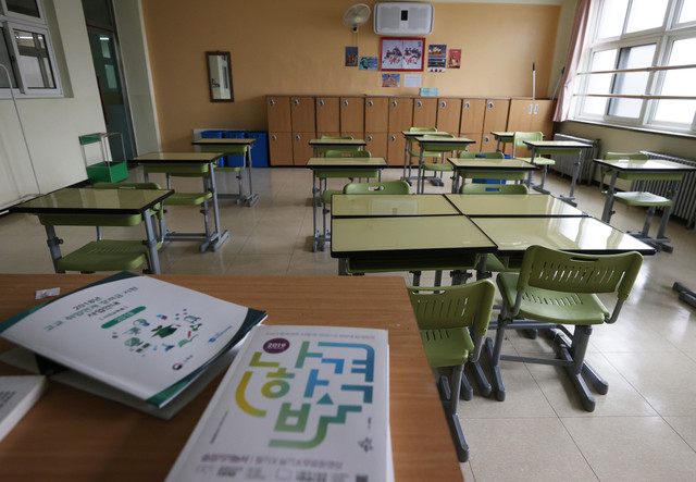 이태원 클럽발 코로나19 집단감염에 유치원생과 초·중·고등학생 등교일이 예정보다 일주일씩 늦춰진 가운데 12일 오후 서울 강남구 서울로봇고등학교 3학년 교실이 텅 비어있다. 연합뉴스 |