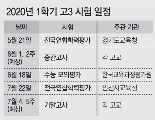 중간고사는 학교에 따라 차이가 있지만 대부분 6월 첫째 둘째 주에 시행할 예정이다. 고3을 가장 먼저 등교하게 한 이유 중 하나는 중간고사를 수행평가가 아닌 지필고사로 치르기 위해서다. 기말고사는 중간고사 이후 6∼8주 지난 7월 넷째 다섯째 주에 진행될 것으로 보인다. 중간고사와 기말고사 사이에 인천시교육청 주관의 7월 학력평가(22일)도 치러야 한다.