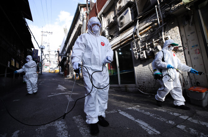 12일 오후 서울 용산구 우사단로 일대 클럽 거리에서 이태원1동 새마을지도자협의회 방역 자원봉사자들이 거리 소독을 하고 있다. 사진=연합뉴스 |
