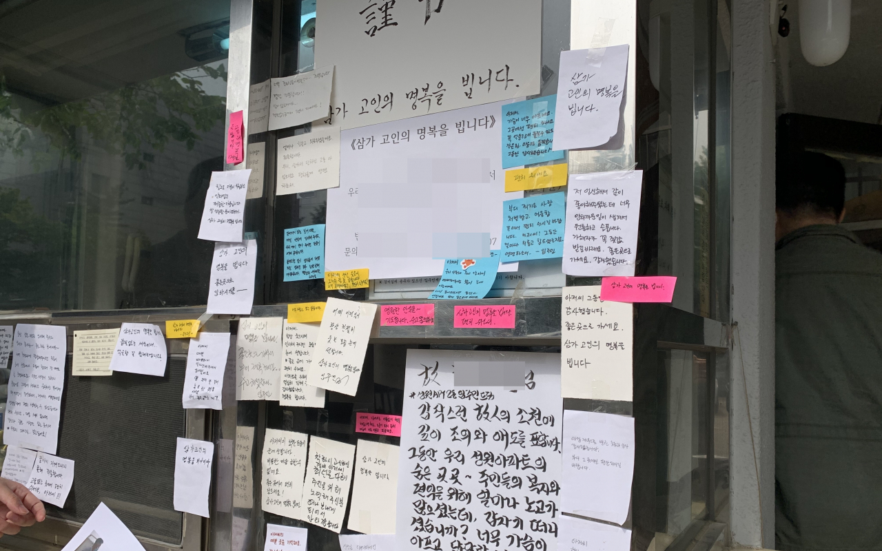 서울 강북구 우이동의 한 아파트 주민들이 경비원 최모 씨를 추모하기 위해 붙인 메모들. [헤럴드DB] |